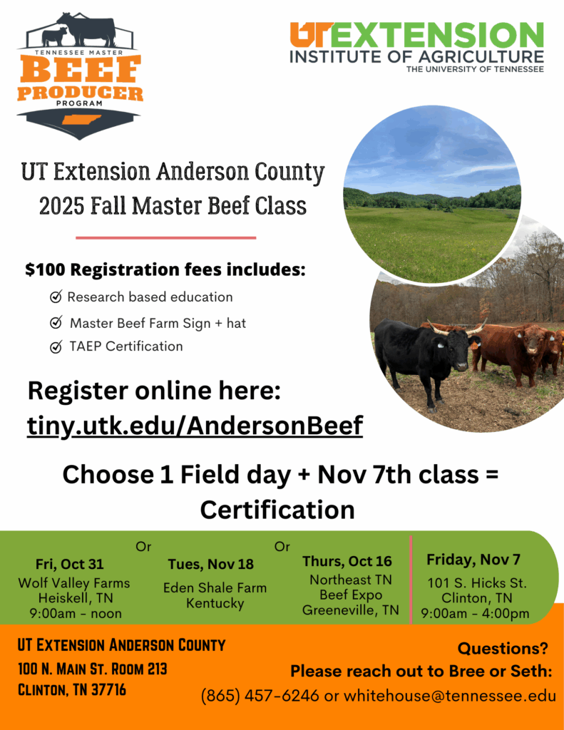 The Master Beef Producer Program is an educational program designed to provide information to Tennessee cow-calf producers to help them be the very best in the country, improve their profitability and position the industry to be competitive with other states. The Master Beef Producer Program is led by a team of University of Tennessee Extension specialists and agents, with the support and involvement of representatives of state level agencies, businesses and organizations that have an interest in the state’s cattle industry. Certification in this program must be renewed every three years to remain eligible for Tennessee Ag Enhancement Program.